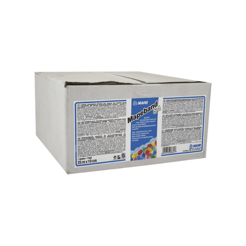 Nastro autoadesivo butilico con tessuto non tessuto alcali resistente per sistema impermeabilizzanti elastici Densità 1,6 g/cm³ Temperatura di applicazione da +5°C a +30°C Larghezza 100 mm Emicode EC1 Plus – a bassissima emissione Spessore ca 2 mm Confezioni rotoli da 25 m o mascherine per fori passanti da 370×370 mm