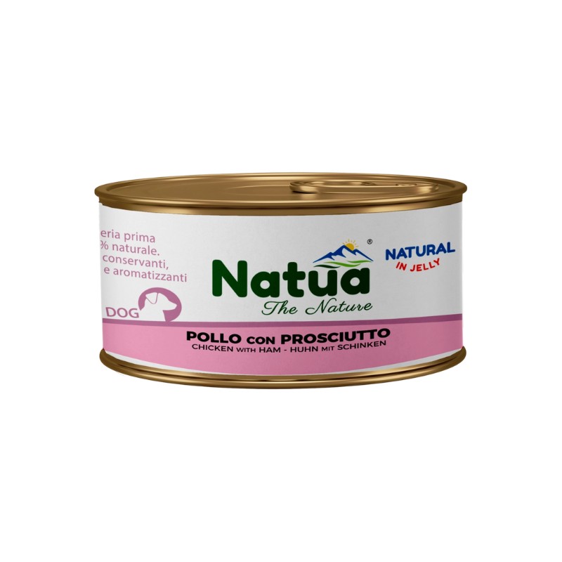 Natua Natural Jelly Pollo e Prosciutto è un alimento umido complementare per cani, lavorato a mano e 100% naturale. La carne bianca di pollo, che costituisce il 62% del prodotto, è magra, povera di grassi e colesterolo, offrendo proteine di alta qualità. Il prosciutto aggiunge un sapore delizioso e un apporto proteico supplementare. Il riso, presente al 1.6%, è una fonte di carboidrati facilmente digeribili che fornisce energia e supporta la digestione. Cotto a vapore in gelatina, questo alimento garantisce morbidezza e il massimo gusto, realizzato con materie prime di alta qualità provenienti da fornitori selezionati. Perfetto per un’alimentazione sana…