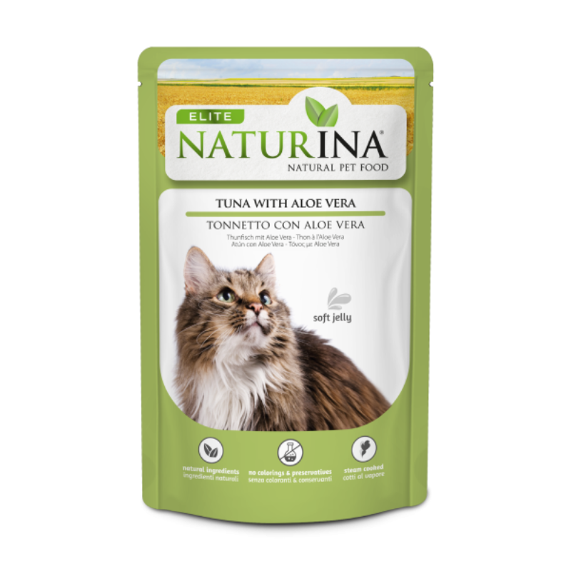 Il cibo umido per gatti Naturina Elite Tonno con Aloe Vera è un alimento complementare a base di tonno e aloe vera, con una piccolissima percentuale di riso e cotto a vapore. Il metodo di cottura poco invasivo, associato a una ricetta Low Grain, regala a Micio un momento di benessere: tutto il gusto della carne e del pesce in una ricetta naturale, senza l’aggiunta di coloranti sintetici e conservanti. Il tonno è pescato in mare con metodi volti a proteggere l’ecosistema marino senza danneggiare le altre specie animali (DOLPHIN SAFE) Naturina Elite Tonno con Aloe Vera per Gatti in Busta si…