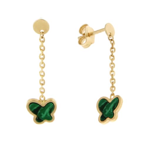 Orecchini Donna Oro Giallo GL102026 Orecchini da donna in oro giallo 750 (18 KT). Orecchini pendenti con farfalle con pietre malachite verde, lunghezza 2,50 cm. Il peso degli orecchini è di 1,60 grammi. Referenza: GL102026 Questi orecchini pendenti in oro giallo 18 kt catturano lo sguardo con le loro farfalle decorate con malachite verde. Un tocco di natura, simbolo di libertà e trasformazione, che danza con grazia ad ogni movimento.