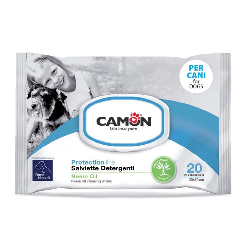Pratiche salviette detergenti per cani e gatti, ideali per pulire e togliere il cattivo odore da pelo, zampe, muso, orecchie. La formulazione a base di olio di neem rinfresca, nutre e protegge da parassiti indesiderati.