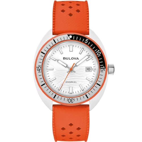 Orologio Bulova Snorkel Clownfish 98B448 Orologio unisex Bulova della collezione Snorkel. Il movimento dell’orologio è al quarzo con funzione datario. La cassa è in bioceramica di colore bianco, diametro 41 mm. Il cinturino è in gomma di colore arancione. Il quadrante è di colore bianco. La resistenza all’acqua è di 10 bar / 100 metri. Referenza: 98B448 Articolo spedito con garanzia e astuccio Bulova