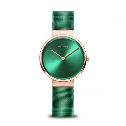 Orologio Donna Bering 14531-868 Orologio da donna Bering della collezione Classic. Il movimento dell’orologio è al quarzo. La cassa è in acciaio PVD oro rosa, diametro 31 mm. Il bracciale è in acciaio di colore verde. Il quadrante è di colore verde. La resistenza all’acqua è di 5 ATM / 50 metri. Referenza: 14531-868 Articolo spedito con garanzia ed astuccio originale Bering