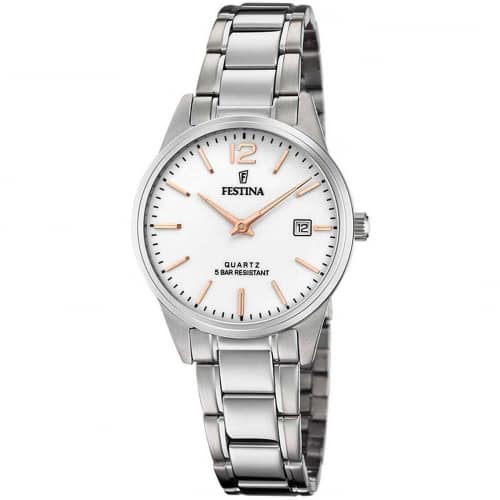 Orologio Donna Festina Classics F20509/2 Orologio da donna Festina della collezione Classics. Il movimento dell’orologio è al quarzo con funzione datario. La cassa è in acciaio, diametro 31 mm. Il bracciale è realizzato in acciaio. Il quadrante è di colore bianco. La resistenza all’acqua è di 5 atm / 50 metri. Referenza: F20509/2 Articolo spedito con garanzia ed astuccio originale Festina