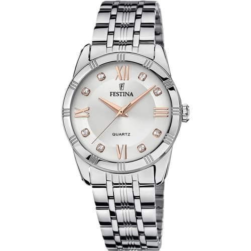 Orologio Donna Festina Mademoiselle F16940/B Orologio da donna Festina della collezione Mademoiselle. Il movimento dell’orologio è al quarzo. La cassa è in acciaio, diametro 32 mm. Il bracciale è realizzato in acciaio. Il quadrante è di colore bianco. La resistenza all’acqua è di 5 atm / 50 metri. Referenza: F16940/B Articolo spedito con garanzia ed astuccio originale Festina
