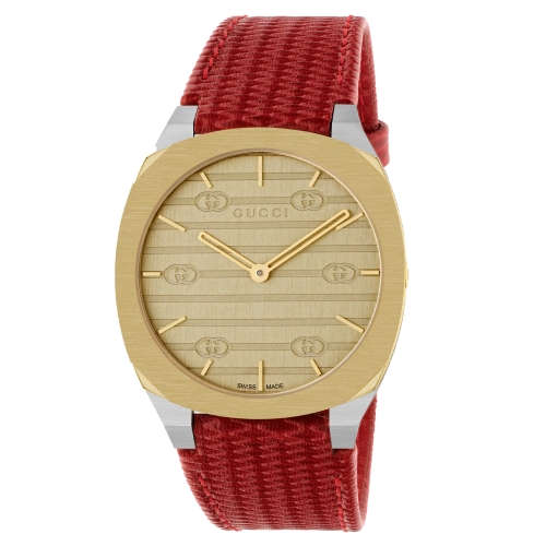Orologio Donna Gucci 25H YA163415 Orologio da donna Gucci della collezione 25H. Il movimento è al quarzo Swiss Made. La cassa è in acciaio e PVD oro, diametro 34 mm. Il cinturino è in pelle di colore rosso. Il quadrante è di colore oro. Il vetro è zaffiro antiriflesso. La resistenza all’acqua è di 3 ATM / 30 metri. Referenza: YA163415 Articolo spedito con astuccio originale Gucci I certificati di garanzia per gli orologi Gucci acquistati dopo il 1° marzo 2022 sono disponibili in esclusiva online. Scarica il certificato all’indirizzo watchwarranty.gucci.com aggiungendo il numero di serie inciso sul retro dell’orologio.