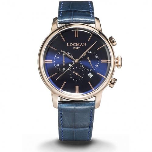 Orologio Locman Collezione 1960 Cronografo 0254R02R-RRBLRGPB Orologio Locman da uomo della collezione 1960. Il movimento dell’orologio è al quarzo con funzioni cronografo e datario. La cassa dell’orologio è realizzata in acciaio di colore oro rosa. Il cinturino dell’orologio è realizzato in pelle di colore blu. Il vetro è minerale antigraffio con trattamento zaffiro. La resistenza all’acqua è di 5 atm / 50 metri. Referenza: 0254R02R-RRBLRGPB Dal design elegante e dalle linee pulite ed essenziali, che richiamano il carattere glamour dei “Fabulous Sixties”. Le performance tecniche della collezione 1960 Crono sono espresse dai tre contatori posizionati alle ore Tre, Sei e Nove, che misurano rispettivamente le 24 ore dell’orologio, i secondi continui e il conta minuti del cronografo. I secondi cronografici sono posizionati nella sfera centrale.