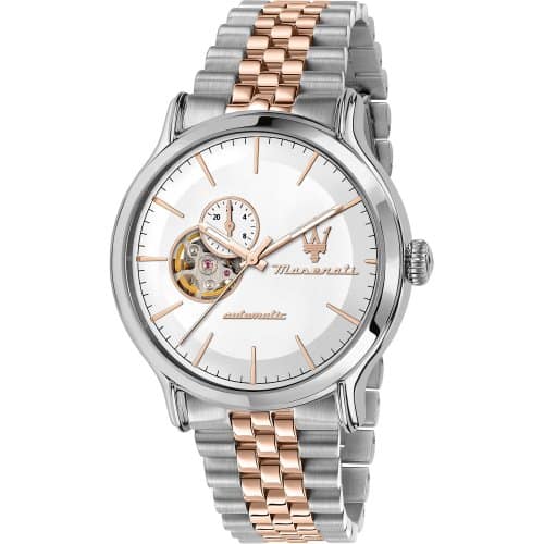 Orologio Automatico Da Uomo Maserati Collezione Epoca. Orologio Con Cassa In Acciaio Lucido Di 42 Mm Con Vetro Zaffiro. Bracciale In Metallo Di Colore Argento E Oro Rosa Con Chiusura A Fibbia Deployante Con Pulsanti. Resistenza All’Acqua Di 10 Atm. Referenza: R8823118008 Articolo spedito con astuccio originale Maserati