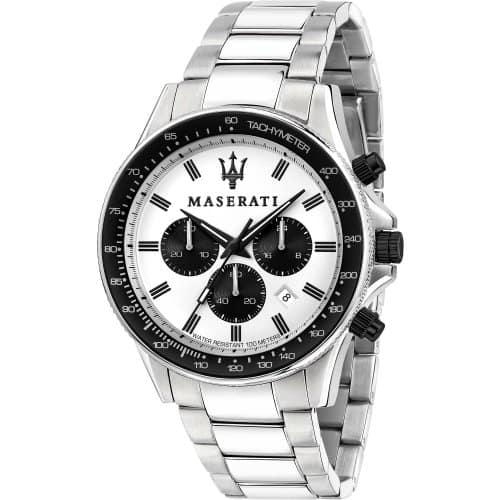 Orologio Maserati da uomo della collezione Sfida, Movimento al quarzo cronografo, Cassa e bracciale in acciaio, Quadrante bianco, W.R. 100m. Referenza : R8873640003 Funzioni: Data, Cronografo, Indicazione 12/24h