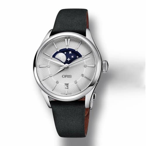 Orologio ORIS Donna ARTELIER GRANDE LUNE DATE 01 763 7723 4051-07 5 18 34FC Le fasi lunari rappresentano la più poetica tra le complicazioni orologiere. Una grande fase di luna campeggia al centro di questo elegante segnatempo per signora rifinito con 11 diamanti scintillanti in luogo degli indici CASSA Oris Artelier, 36.00 mm, 1.417 inches, Acciaio MATERIALE Cassa in acciaio inossidabile, in più parti MISURA 36.00 mm, 1.417 inches VETRO zaffiro, ricurvo sui due lati, trattamento antiriflesso sulla parte interna FONDELLO Acciaio inossidabile, avvitato, oblò in vetro minerale CORONE E PULSANTI Corona in acciaio inossidabile IMPERMEABILITÀ 5 bar ANSE 18 mm MOVIMENTO Carica automatica fasi lunari, data sviluppato da Oris REFERENZA Oris 763, base SW 220-1 DIMENSIONI Ø 25.60 mm, 11 1/2”’ FUNZIONI Lancette centrali per ore, minuti e secondi, finestra delle fasi lunari, finestra della data, data istantanea, correttore della data, regolazione fine e arresto dei secondi CARICA Carica automatica RISERVA DI CARICA 38 h ALTERNANZE 28’800 A/h, 4 Hz RUBINI 26 QUADRANTE Argentato MATERIALE Quadrante argento guilloché con 11 diamanti CINTURINO/BRACCIALE Pelle MATERIALE Cinturino in pelle, nero, fibbia deployante in acciaio inossidabile