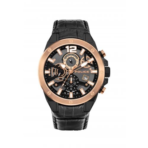 Orologio Police da uomo della collezione Saiho, Movimento al quarzo multifuzione dual time, Cassa in acciaio IP nero con ghiera oro rosa, Cinturino in pelle nero, W.R. 5 ATM. Referenza: PL.15711JSBR/61 Non è quello che cercavi? Scopri tutti gli orologi Police