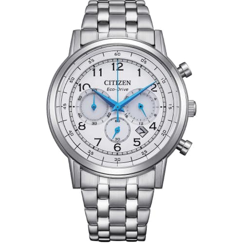 Orologio Uomo Citizen OF Crono Classic CA4630-53A Orologio da uomo Citizen della collezione OF Crono Classic. Il movimento dell’orologio è al quarzo Eco Drive (carica solare) con funzioni cronografo, datario e indicazione delle 24h giornaliere. La cassa è in acciaio, diametro 42 mm. Il bracciale è in acciaio. Il quadrante è di colore bianco. La resistenza all’acqua è di 10 bar / 100 metri. Referenza: CA4630-53A Articolo spedito con garanzia ufficiale 5 anni e astuccio Citizen Cos’è la tecnologia Eco Drive? Una delle sfide di Citizen: sviluppare una tecnologia che garantisse il costante funzionamento dell’orologio, in qualsiasi parte al mondo. Nel 1976, hanno inventato il primo orologio analogico al quarzo alimentato a luce che funziona utilizzando esclusivamente la luce come fonte d’energia. Questa tecnologia, ora conosciuta come Eco-Drive, può generare l’energia da qualsiasi sorgente di luce (luce artificiale, luce naturale e persino luce fioca) per continuare a far funzionare gli orologi senza mai sostituire la batteria.