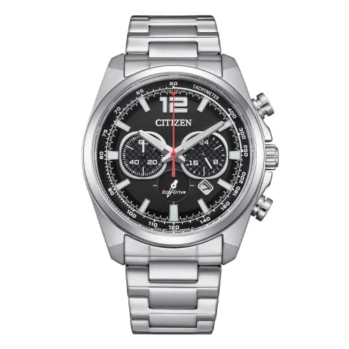 Orologio Uomo Citizen OF Racing Crono CA4640-50E Orologio da uomo Citizen della collezione OF Racing Crono. Il movimento dell’orologio è al quarzo Eco Drive (carica solare) con funzioni cronografo, datario e indicazione delle 24h giornaliere. La cassa è in acciaio, diametro 41 mm. Il bracciale è in acciaio. Il quadrante è di colore nero. La resistenza all’acqua è di 10 bar / 100 metri. Referenza: CA4640-50E Articolo spedito con garanzia ufficiale 5 anni e astuccio Citizen Cos’è la tecnologia Eco Drive? Una delle grandi sfide di Citizen era sviluppare una tecnologia che garantisse il funzionamento costante dell’orologio, ovunque nel mondo. Nel 1976, il brand ha rivoluzionato l’orologeria inventando il primo orologio analogico al quarzo alimentato a luce. Questa innovativa tecnologia, oggi conosciuta come Eco-Drive, utilizza esclusivamente la luce come fonte di energia, eliminando la necessità di sostituire la batteria. Il sistema Eco-Drive è in grado di generare energia da qualsiasi sorgente luminosa: luce artificiale, luce naturale e persino luce fioca, assicurando un funzionamento continuo e sostenibile dell’orologio.