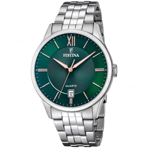 Orologio Uomo Festina Classics F20425/7 Orologio da uomo Festina della collezione Classics. Il movimento dell’orologio è al quarzo con funzione datario. La cassa è in acciaio, diametro 43 mm. Il bracciale è in acciaio. Il quadrante è di colore verde. La resistenza all’acqua è di 5 atm / 50 metri. Referenza: F20425/7 Articolo spedito con garanzia ed astuccio originale Festina