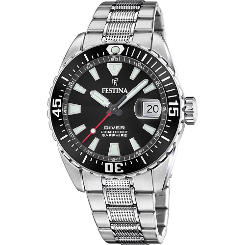 Orologio Uomo Festina Diver F20669/3 Orologio da uomo Festina della collezione Diver. Il movimento dell’orologio è al quarzo con funzione datario. La cassa è in acciaio, diametro 44 mm. Il bracciale è in acciaio. Il quadrante è di colore nero. La resistenza all’acqua è di 20 atm / 200 metri. Referenza: F20669/3 Articolo spedito con garanzia ed astuccio originale Festina