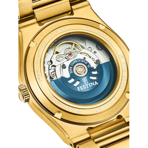 Orologio Uomo Festina Swiss Made Rivé F20032/1 Orologio da uomo Festina della collezione Swiss Made Rivé. Il movimento dell’orologio è meccanico a carica automatica con funzioni datario. La cassa è in acciaio PVD oro, diametro 40 mm. Il bracciale è in acciaio PVD oro. Il quadrante è di colore bianco. Vetro zaffiro. La resistenza all’acqua è di 10 atm / 100 metri. Referenza: F20032/1 Orologio Festina Rivé Swiss Made, simbolo della tradizione orologiera svizzera, con movimento automatico di alta precisione. Vetro zaffiro antiriflesso per massima chiarezza e resistenza nel tempo, unendo affidabilità ed esclusività. Articolo spedito con astuccio e garanzia Festina