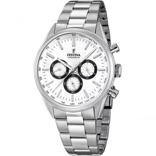 Orologio Uomo Festina Timeless Chronograph F16820/Q Orologio da uomo Festina della collezione Timeless Chronograph. Il movimento dell’orologio è al quarzo con funzioni datario, cronografo, indicazione delle 24h giornaliere. La cassa è in acciaio, diametro 44 mm. Il bracciale è in acciaio. Il quadrante è di colore bianco. La resistenza all’acqua è di 5 atm / 50 metri. Referenza: F16820/Q Articolo spedito con astuccio originale Festina