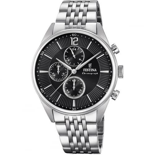 Orologio Uomo Festina Timeless Chronograph F20285/4 Orologio da uomo Festina della collezione Timeless Chronograph. Il movimento dell’orologio è al quarzo con funzioni datario, cronografo. La cassa è realizzata in acciaio, diametro 41 mm. Il bracciale è realizzato in acciaio. Il quadrante è di colore nero. La resistenza all’acqua è di 5 atm / 50 metri. Referenza: F20285/4 Articolo spedito con garanzia ed astuccio originale Festina