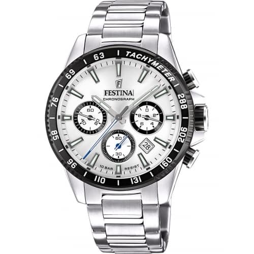 Orologio Uomo Festina Timeless F20560/1 Orologio da uomo Festina della collezione Timeless. Il movimento dell’orologio è al quarzo con funzioni datario, cronografo. La cassa è realizzata in acciaio, diametro 45 mm. Il bracciale è realizzato in acciaio. Il quadrante è di colore argento. La resistenza all’acqua è di 10 atm / 100 metri. Referenza: F20560/1 Articolo spedito con astuccio originale Festina