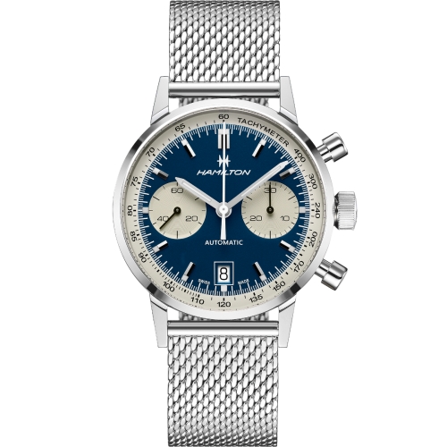Orologio Uomo Hamilton American Classic Intra-Matic Auto Chrono H38416141 Orologio da uomo Hamilton della collezione American Classic. Il movimento dell’orologio è meccanico a carica automatica Swiss Made con funzioni datario e cronografo. La cassa è in acciaio, diametro 40 mm. Il bracciale è in acciaio. Il quadrante è di colore blu. La resistenza all’acqua è di 10 bar / 100 metri. Referenza: H36205130 Rivisitazione moderna di un pezzo iconico datato 1968, Intra-Matic Auto Chrono attira tutti gli sguardi, con il suo design sportivo e allo stesso tempo classico e il quadrante effetto “panda”. Questo modello d’ispirazione vintage è abbinato a un bracciale in maglia di acciaio lavorato finemente, per offrire il massimo comfort e uno stile unico. Articolo spedito con garanzia ed astuccio originale Hamilton