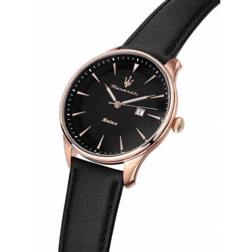 Orologio Uomo Maserati Collezione Tradizione R8851146001 Orologio Maserati da uomo della collezione Tradizione Solar. Il movimento dell’orologio è al quarzo a carica solare con funzioni Data. La cassa del diametro di 45 mm è in acciaio di colore oro rosa. Il cinturino è in pelle di colore nero. Il quadrante è di colore nero. La resistenza all’acqua è di 10 atm / 100 metri. Referenza : R8851146001 Articolo spedito con astuccio originale e garanzia Maserati
