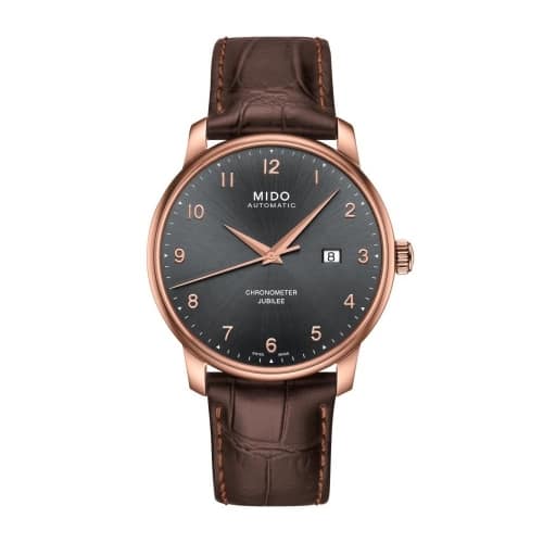 Orologio Uomo Mido Baroncelli COSC M037.608.36.062.00 Orologio da uomo Mido della collezione Baroncelli. Il movimento dell’orologio è meccanico a carica automatica Mido Calibro 80 Si con riserva di carica di 80 ore e 25 gioielli, con funzioni data. La cassa dell’orologio del diametro di 42 mm è in acciaio di colore oro rosa. Il cinturino dell’orologio è in pelle di colore marrone. Il quadrante è di colore grigio. Il vetro è zaffiro antigraffio. La resistenza all’acqua è di 5 ATM / 50 metri. Referenza: M037.608.36.062.00 Orologio con movimento certificato COSC. COSC (Contrôle Officiel Suisse des Chronomètres) è un certificato che serve a riconoscere che ogni movimento, una volta uscito dai suoi laboratori, è preciso ed è classificato come cronometro svizzero. MIDO ha deciso di ottimizzare il suo movimento più rappresentativo, il Caliber 80, dotandolo di una spirale in silicio. Oltre alle sue proprietà anti-magnetiche, questo materiale, imprescindibile in alta orologeria, offre una precisione a lungo termine molto superiore a quella di una normale spirale, con caratteristiche di resistenza agli urti più elevate. L’orologio è un cronometro certificato COSC e offre un’eccezionale autonomia fino a 80 ore di riserva di carica. Articolo spedito con astuccio originale Mido