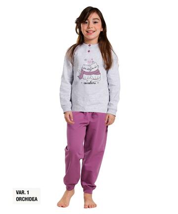 Pigiama da bambina a serafino in jersey di CALDO cotone (medio peso) con stampa e pantalone lungo con polsini.Taglie: 3 – 4/5 – 6/7 – 8/9 – 10/11 ANNILINEA AUTUNNO – INVERNO