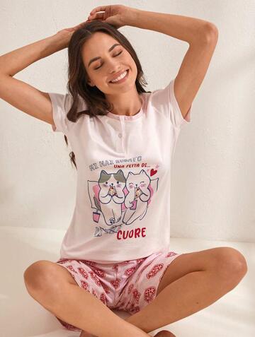 Pigiama donna a serafino in jersey di cotone con maniche corte e stampa e pantaloncino corto fantasia.Taglie: S – M – L – XL e nei colori Panna e Rosa