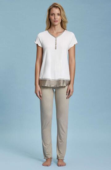 Pigiama donna a serafino e manica corta in jersey di viscosa con inserti in raso fantasia, profilo in pizzo e pantalone lungo.Made in Italy.Taglie: 3/M – 4/L – 5/XL – 6/XXL