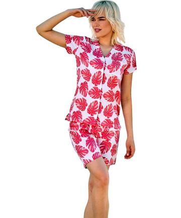 Pigiama donna con giacca aperta a manica corta in jersey di cotone fantasia e pantaloncino corto.Taglie: S – M – L – XL