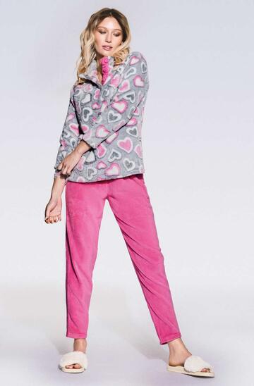 Pigiama a serafino con bottoni in CALDO e morbido PAIL CORAL fantasia e pantalone tinta unita senza polsini.Taglie: S – M – L – XL