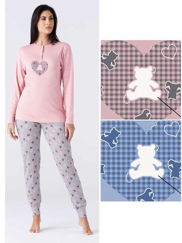 Pigiama donna a serafino in jersey di cotone caldo (medio peso) con stampa cuore e pantalone fantasia con polsini.Taglie: S – M – L – XL