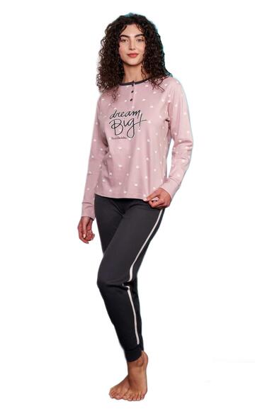 Pigiama donna a serafino in jersey di cotone caldo (medio peso) con stampa e pantalone con profilo in contrasto e polsini.Composizione: melange 88% cotone, 12% poliestereTaglie: S – M – L – XL