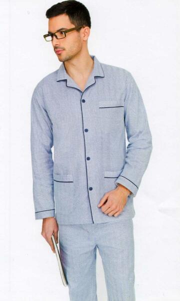 Pigiama uomo con giacca aperta e collo camicia in TESSUTO DI FLANELLA con motivo spinato, due tasche e taschino, pantalone con apertura 2 bottoni ed elastico in vita.Made in Italy.COLORE DELLE FOTO AZZURRO MEDIO