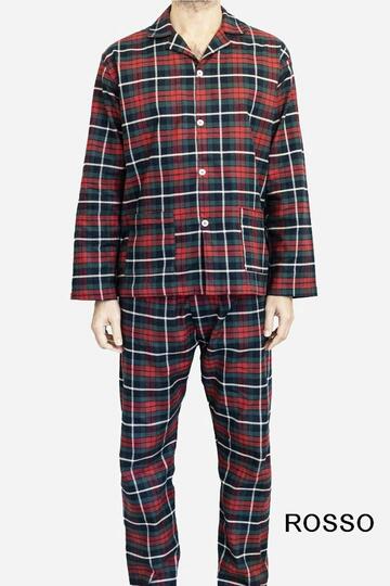 Pigiama uomo con giacca aperta e collo camicia in TESSUTO DI FLANELLA LEGGERA (medio peso) fantasia a quadri con maniche lunghe e pantalone lungo con elastico in vita.Made in Italy.Taglie: 48/M – 50/L – 52/XL – 54/XXL