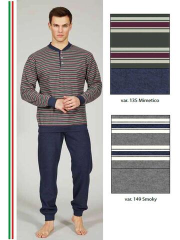 Pigiama uomo a serafino in caldo jersey di cotone lanato (punto Milano) con motivo a righe e pantalone con polsini.Made in ItalyTaglie:4-48=M5-50=L6-52=XL7-54=XXL
