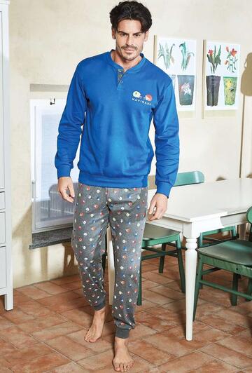 Pigiama uomo a serafino in jersey di cotone caldo (medio peso) con stampa logo e pantalone fantasia con polsini.Taglie: 46/S – 48/M – 50/L – 52/XL – 54/XXL