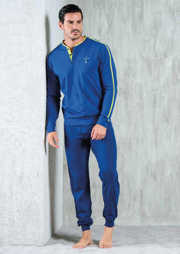 Pigiama a serafino in jersey di cotone con bande colorate, logo e pantalone lungo con polsini.Taglie: 48/M – 50/L – 52/XL – 54/XXL