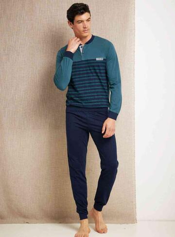 Pigiama uomo a serafino in jersey di cotone con motivo a righe e pantalone lungo con polsini.Taglie: 48/M – 50/L – 52/XL – 54/XXL