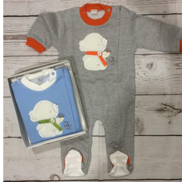 Pigiamone girocollo da neonato, felpato internamente.Chiusura laterale con bottoni automatici e zip laterale per tutta la lunghezza. Piedini antiscivolo, stampa orsetto sulla parte frontale. Colori: Grigio chiaro e Avio Taglia: 9-12-18-24-36 Mesi