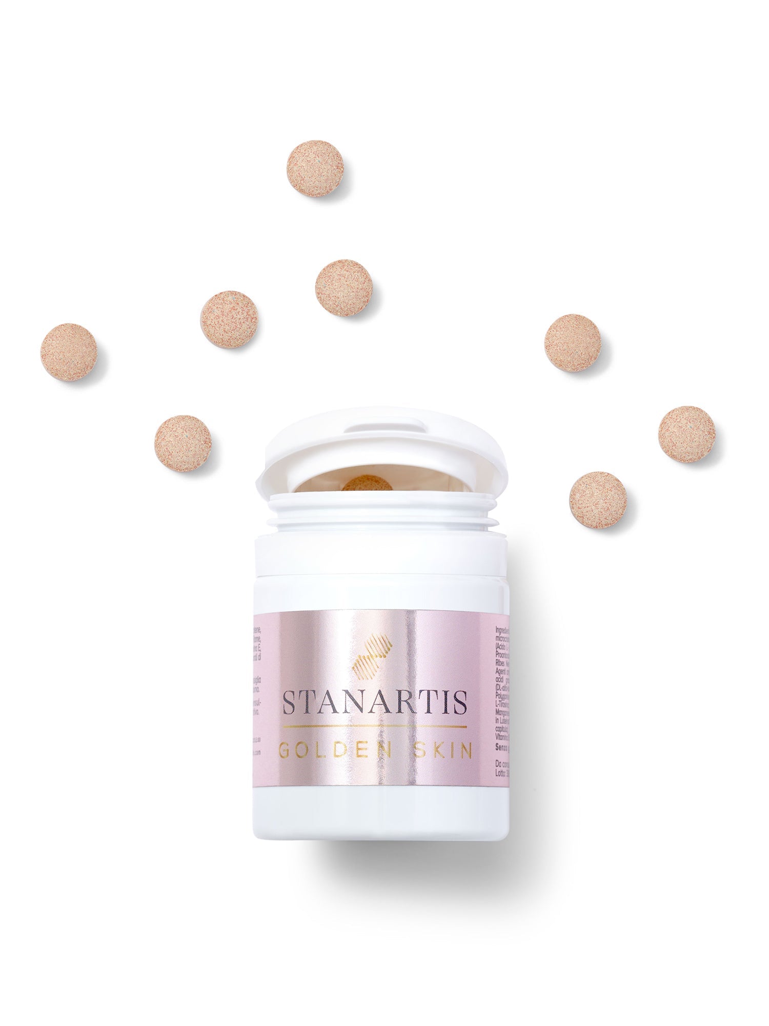 Grazie al suo mix di acceleratori dell’abbronzatura a base di beta carotene, l’integratore pelle Golden Skin favorisce un effetto antiossidante, contrastando dai radicali liberi prodotti dai raggi solari. I suoi principi attivi pro-abbronzatura favoriscono la produzione di melanina, il beta carotene protegge la pelle dalle scottature, il rame agevola la pigmentazione e protegge le cellule dallo stress ossidativo, le vitamine C, A ed E rendono la pelle più compatta e luminosa, mentre il selenio ne previene l’invecchiamento. Infine lo zinco contribuisce alla rigenerazione cellulare, il collagene ne aumenta l’elasticità e il magnesio contribuisce alla normale formazione dei tessuti connettivi.