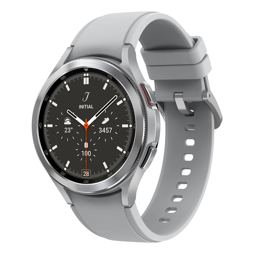 Samsung Galaxy Watch4 Classic . Dimensioni schermo: 3,56 cm (1.4 ), Tecnologia display: OLED, Risoluzione schermo: 450 x 450 pixel, Touch screen. Frequenza del processore: 1180 MHz, Capacità RAM: 1500 MB, Memoria flash: 16 GB. Wifi. GPS (satellite). Capacità della batteria: 247 mAh. Peso: 52 g. Colore del braccialetto: grigio. Sistema operativo installato: Wear OS – Prodotto nuovo