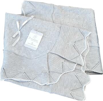 Scialle in maglia lavorata con volant per culla.Confezionata in un’elegante scatola di cartone.Dimensioni 80×100 cmColori: Rosa, Azzurro, Grigio, Panna