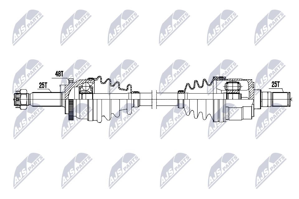 Lato montaggio: Assale anteriore Sx; Modalità di trasmissione: Cambio manuale; Dentatura esterna lato differenziale: 25; Dentatura esterna lato ruota: 25; Lunghezza [mm]: 655; N° denti anello ABS: 48; Numero di fabbricazione: NPW-HY-644