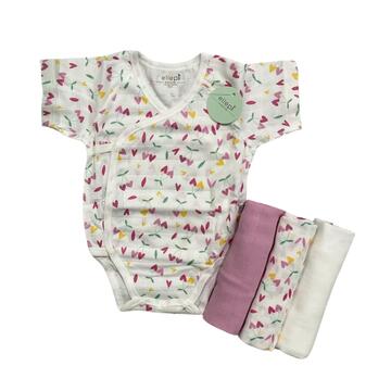 Set nascita in viscosa di bamboo composto da un body taglia unica 1/3 mesi e 3 garze.Ideare come regalo per neonati.Colori: Bianco/Giallo, Bianco/Cielo, Bianco/Rosa