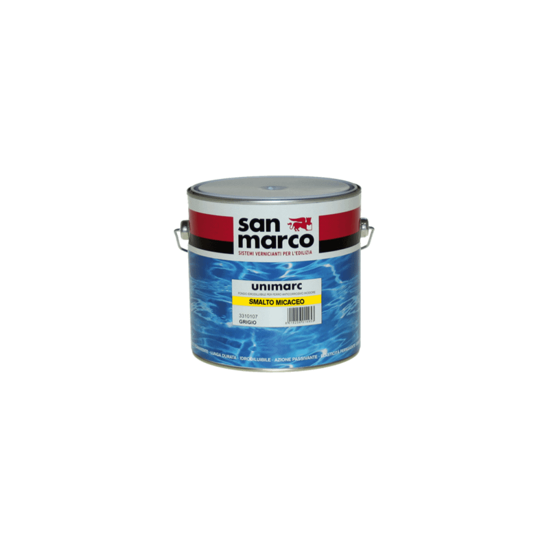 UNIMARC SMALTO MICACEO, protettivo acrilico idrodiluibile ad effetto micaceo per interno-esterno -UNIMARC SMALTO MICACEO è uno smalto a base di resine acriliche e cariche lamellari, che protegge e decora i supporti metallici. La sua speciale formulazione esplica: – Effetto barriera: la particolare struttura lamellare crea degli strati paralleli di carica all’interno del film, che ostacolano la penetrazione dell’acqua e degli agenti atmosferici. – Effetto scudo: l’ossido di ferro micaceo e l’alluminio presenti nel prodotto impediscono alle radiazioni ultraviolette di raggiungere gli strati sottostanti, ritardando il degrado del legante. Per le caratteristiche estetiche il prodotto può essere impiegato su diversi supporti per creare gradevoli effetti estetici – Attrezzi per Utlizzo penello,rullo,spruzzo – Diluzione con acqua – Diluzione con pennello o rullo Pronta all’uso o max 5% – Diluzione a spruzzo 15% – Resa 12/14 mq/l per strato – Strati 2 –