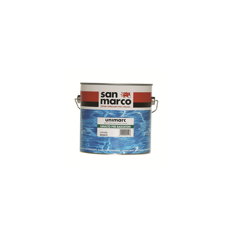 UNIMARC SMALTO PER RADIATORI è uno smalto idrodiluibile, a base di resine acriliche, per finiture satinate di elementi riscaldanti; è inodore pertanto particolarmente idoneo per applicazioni all’interno -Il prodotto è formulato in modo da resistere ad elevate temperature senza subire degrado e in modo da facilitare la copertura anche di spigoli e bordi – Le resine acriliche in dispersione acquosa, di cui è composto, conferiscono al prodotto un’elevata lavabilità, resistenza all’ingiallimento e buona adesione su svariati tipi di supporti – Come tutti i prodotti della linea idrodiluibili, UNIMARC SMALTO PER RADIATORI risulta facile da applicare e veloce nell’essiccazione – Colore Bianco – Attrezzi per Utilizzo pennello,rullo,spruzzo – Diluzione con Acqua – Pronto all’uso per pennello e rullo – Diluzione per spruzzo 10-15% – Resa 8-10 mq/l per strato – Strati 2 –