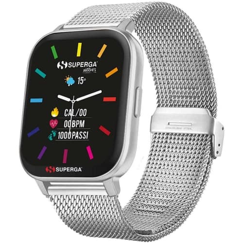 Smartwatch Superga Unisex SW-STC011 Smartwatch unisex Superga della collezione Ink 2.0. La cassa è realizzata in alluminio, diametro 42 mm. Il bracciale è realizzato in acciaio con chiusura magnetica. Il display è di 1.69 pollici. La resistenza all’acqua è IP67. Referenza: SW-STC011 Funzioni: Avviso di chiamata, Notifiche SMS e WhatsApp, Distanza, Misurazione Battico Cardiaco, Pressione Sanguigna, Ossigenazione sangue, Contapassi, Monitoraggio sonno, Contatore Calorie consumate. Altre funzioni: Sveglia, Sedentary Reminder, Controllo remoto musica. Compatibile con iPhone – iOS 9 o superiore, con smartphone Android 5.0 e versioni superiori. Tempo di ricarica 100%: 1 ora. Cavo di ricarica in dotazione con attacco magnetico App dedicata (Da Fit) da scaricare sullo smartphone. Articolo spedito con astuccio originale Superga