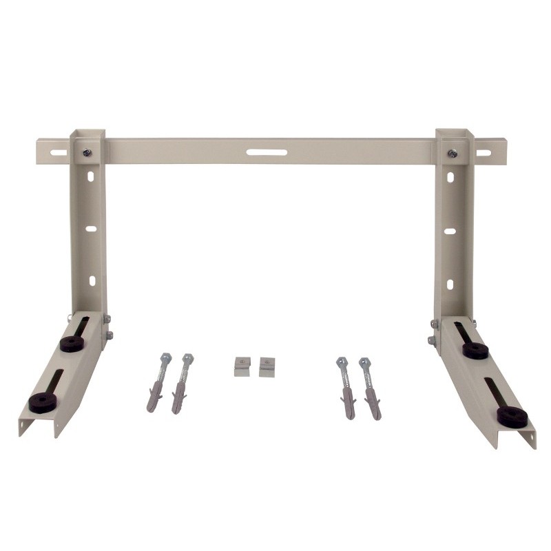 Supporto in acciaio stampato verniciato con polveri epossidiche RAL 9002 con barra di regolazione. Completo di kit di fissaggio e antivibranti per unità esterne motocondensanti