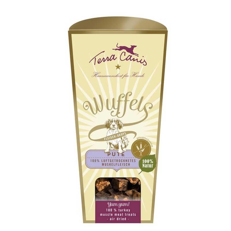 Gli snack per cani Terra Canis Wuffels al Tacchino sono croccanti premietti fatti a mano, ad alto contenuto proteico, realizzati con tanta cura e amore allinterno di uno stabilimento artigianale tedesco.